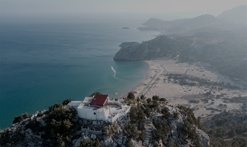 Nested on the sun-drenched eastern shore of Rhodes, Tsambika Beach unfolds as a golden ribbon of soft sand and crystal Aegean waters, framed by rugged cliffs and the historic Panagia Tsambika monastery.